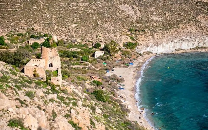So, this place is called San Pedro cove, and it’s tucked away right in the heart of the Cabo de Gata-Níjar Natural Park in Almería province. There’s been a hippie community living there for decades, maybe about 50 people, and they pretty much live cut off from everyone else. They make a living by crafting things out of leather and shells and selling food and drinks to the tourists who show up. They’ve built their own homes right there using local stuff like rock, wood, cane, and bricks, whether it’s down on the beach, deeper in the valley, or up on the mountain. They’re completely self-sufficient, thanks to a natural spring that gives them fresh water, which they even use to water the vegetable gardens they eat from.